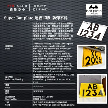 防彈不碎超級車牌,是經過長達14個月研究及反覆測試的全新車牌。並透過無縫製作車牌將不碎膠片、字粒和反光紙三個部份融為一體,比傅統的車牌更耐用,無縫製作技術不但令車牌更美觀,更比市面上的大部分車牌都要耐用。